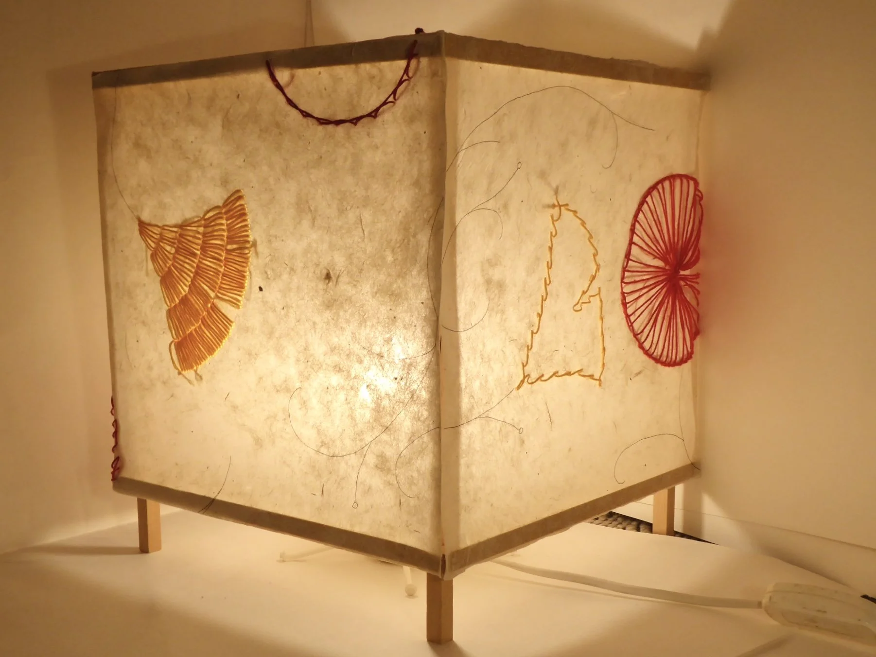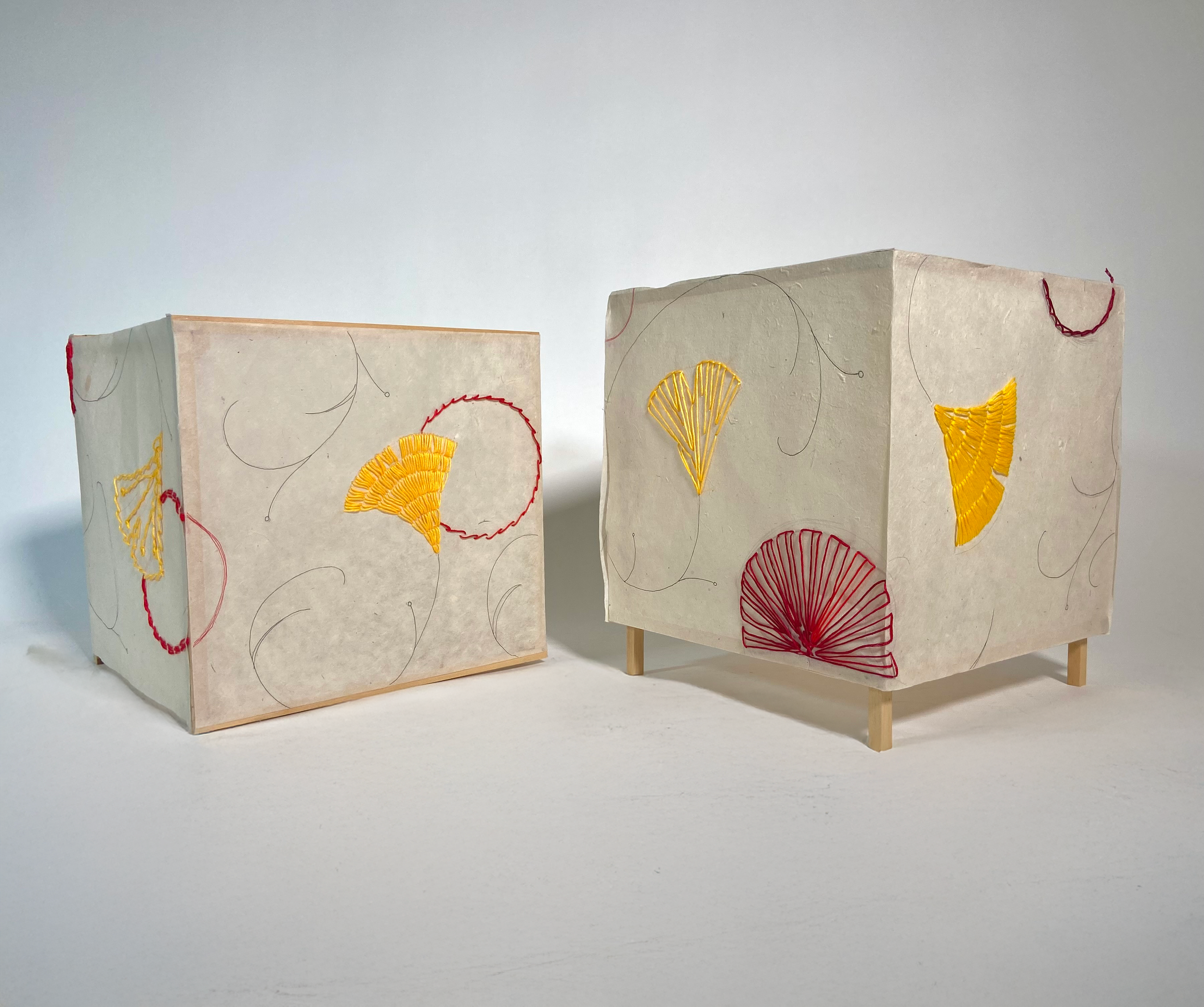 The structure is made from dowels of pine wood which is then dressed in a body of organic textured translucent paper. I combined the classic minimalistic designs of Noguchi through the cube shapes, which is then contrasted by detailed embroidery stitching and line-work on the paper which takes from Art Nouveau motifs. ‘Gingko’ is named this after the yellow gingko leaves which are embroidered on the facade.