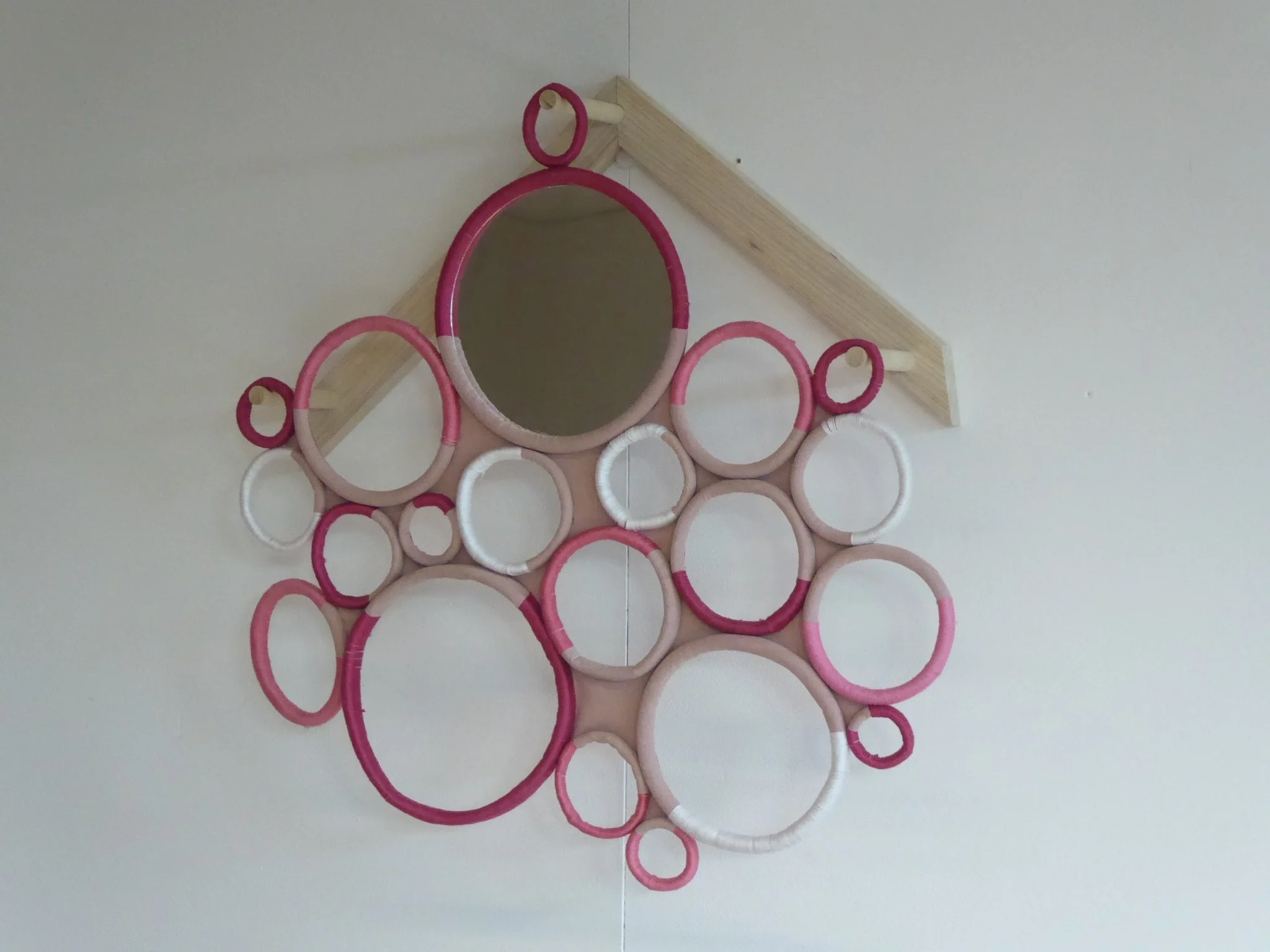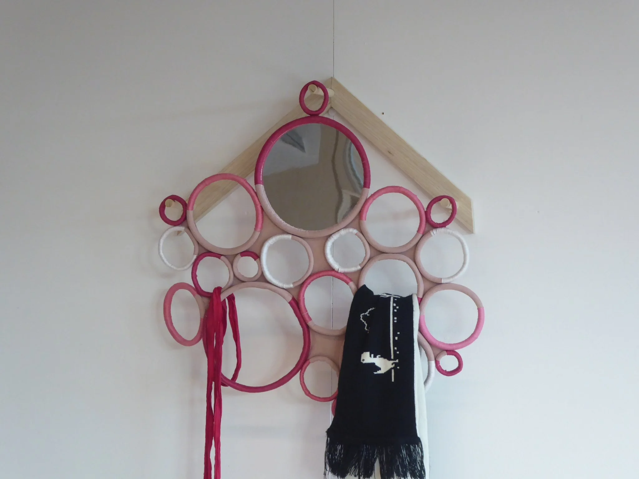 Looped is an Alcantara fabric accessory hanger - finished with embroidery thread, an acrylic mirror and an ash wood hanger.